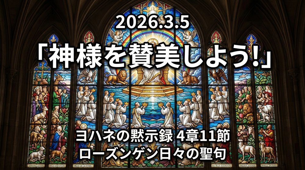 私たちの主、また神よ、あなたこそ、栄光と誉れと力を受けるにふさわしい方。あなたは万物を造られ、万物はあなたの御心によって存在し、また造られたからです。