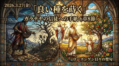ガラテヤの信徒への手紙 「良い種を蒔く」ガラテヤの信徒への手紙 6章8節 ローズンゲン日々の聖句2026年3月27日「良い種を蒔く」 2025.3.27 伝道師 青木宗達 新約聖書 ガラテヤの信徒への手紙 6章8節自分の肉に蒔く者は、肉から滅びを刈り取り、霊に蒔く者は、霊から永遠の命を刈り取ります。(協会共同訳) わたしたちの父なる...